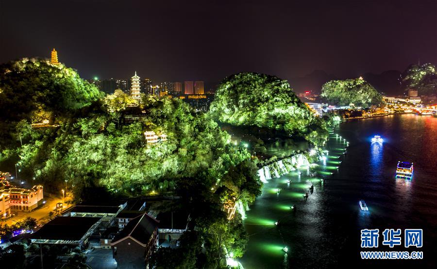2月8日,在广西柳州市区蟠龙山景区附近,游客坐船观赏柳江两岸夜景。新华社发(李斌 摄)