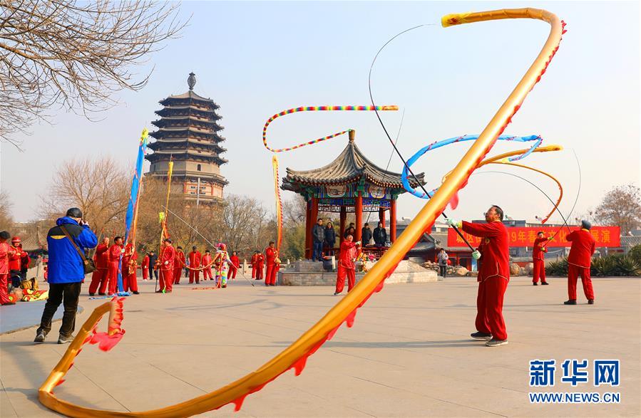 2月11日,表演者在石家庄市正定古城进行民俗表演。
