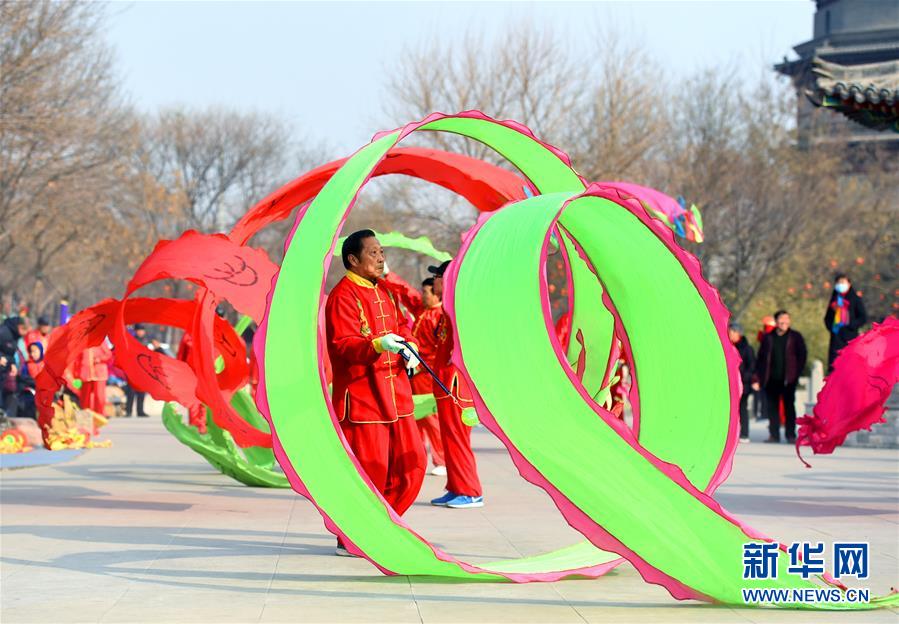 2月11日,表演者在石家庄市正定古城进行民俗表演。