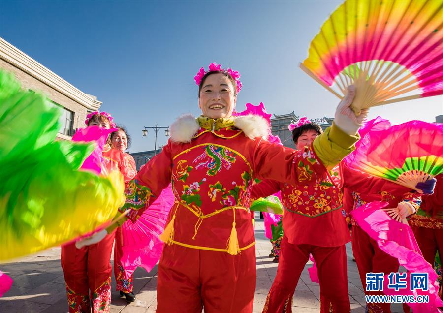 2月12日,民间艺人在内蒙古呼和浩特市玉泉区大盛魁广场表演秧歌。 新华社发(丁根厚 摄)