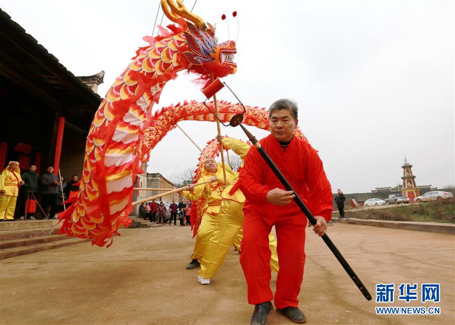 2月12日,江西省吉安市吉水县黄桥镇上栋村的村民在祠堂前舞龙。 新华社发(廖敏 摄)