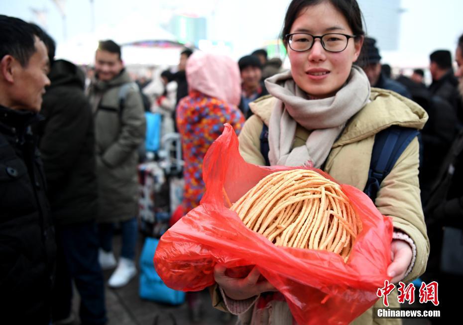在阜阳火车站广场上,在上海读书的大学生李嘉宁带着妈妈亲自炸的撒子准备返程。 韩苏原 摄