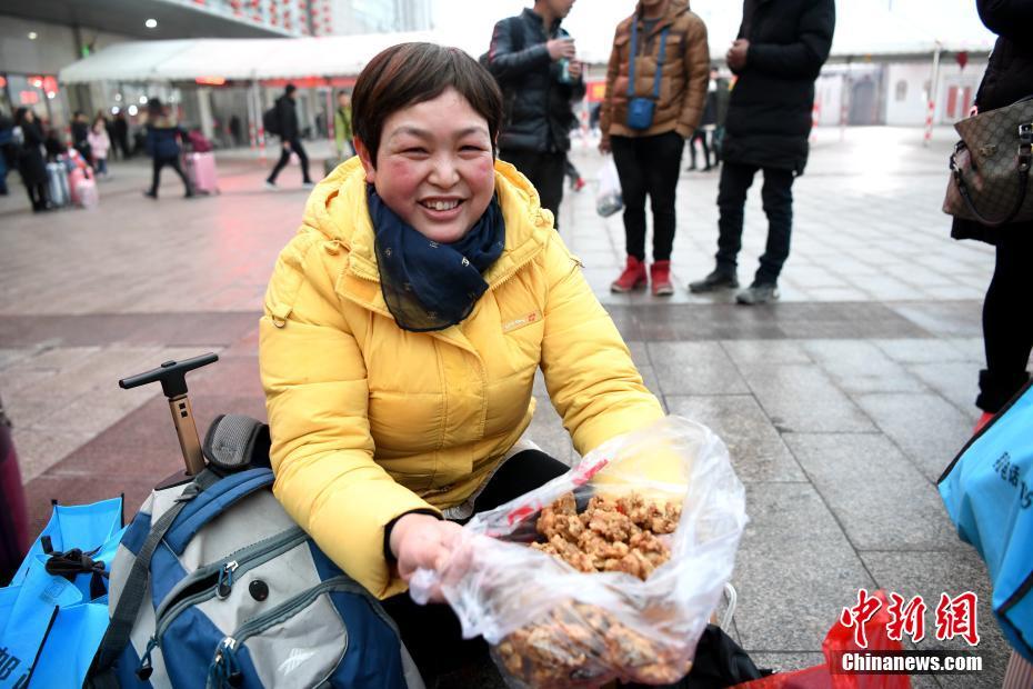在阜阳火车站广场上,张铁梅和丈夫带着满满一大袋“小酥肉”、“麻叶”等家乡特产准备返程。 韩苏原 摄