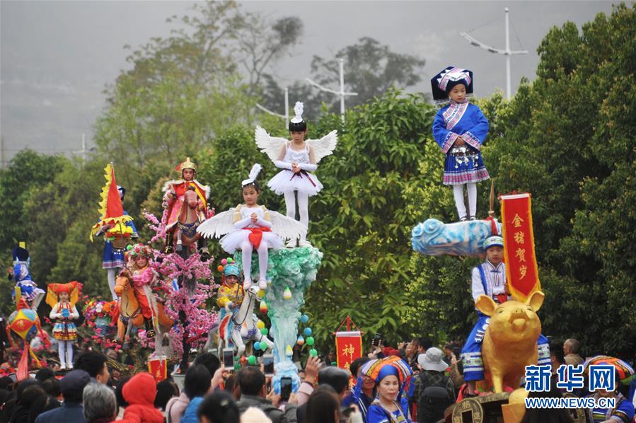 2月11日,巡游队伍行进在广西靖西市街道上。