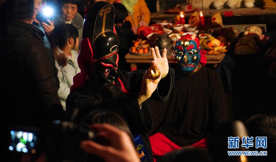 2月13日,傩舞艺人在白舍镇田东村表演傩舞。 正月期间,江西南丰县的傩师们走村串巷跳起傩舞,迎春祈福。据了解,南丰傩舞历史悠久,傩班每年正月初一“起傩”,到元宵节后一至三日结束,称之为“收傩”。 新华社记者胡晨欢摄