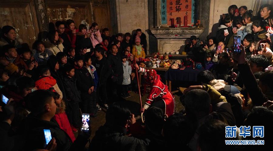 2月13日,傩舞艺人在白舍镇田东村表演傩舞。 正月期间,江西南丰县的傩师们走村串巷跳起傩舞,迎春祈福。据了解,南丰傩舞历史悠久,傩班每年正月初一“起傩”,到元宵节后一至三日结束,称之为“收傩”。 新华社记者胡晨欢摄
