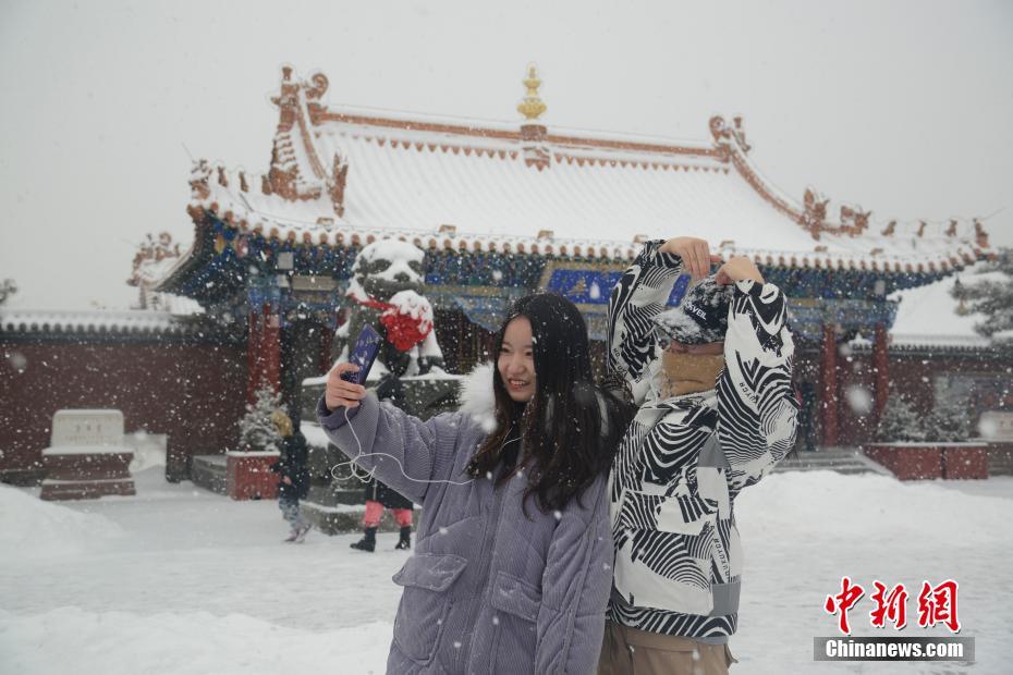 2月14日,两位女孩在大召寺前自拍。13日夜间起,内蒙古自治区呼和浩特市迎来该地区2019年首场大范围降雪。中新社记者 刘文华 摄