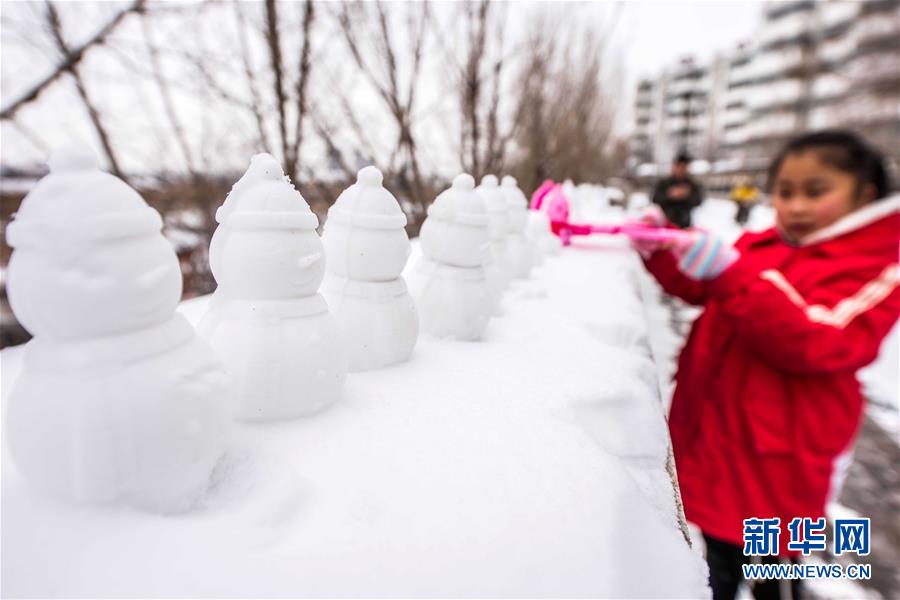 2月14日,一名小朋友在山东省青州市街头制作小雪人。 当日,我国华北黄淮等地迎来降雪天气,漫天飞雪将大地装扮成一幅洁白的画卷。 新华社发(王继林 摄)