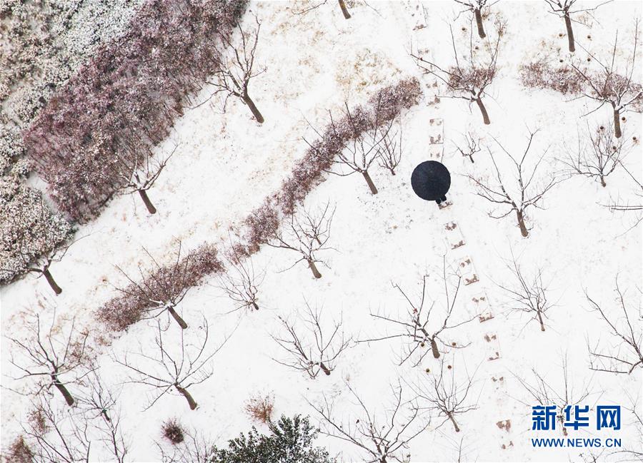 2月14日,在河北省邯郸市,一名市民从街头花园穿过。 当日,我国华北黄淮等地迎来降雪天气,漫天飞雪将大地装扮成一幅洁白的画卷。 新华社发(乔海龙 摄)