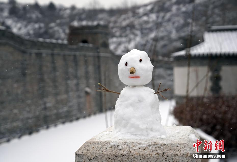 2月14日,北京密云古北水镇迎来新年瑞雪。当日,北京迎来今冬第三场雪,降雪范围广、持续时间长。图为游客在街边堆放的雪人。中新社记者 毛建军 摄