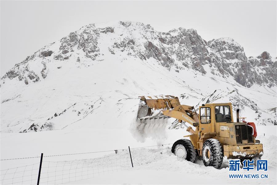 一台推土机在杂多县扎青乡除雪(2月14日摄)。 新华社发(张龙 摄)