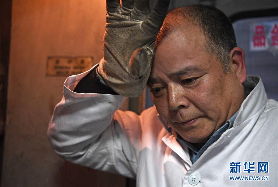 赵以亮在火炉前擦拭额头上的汗水(2月15日摄)。