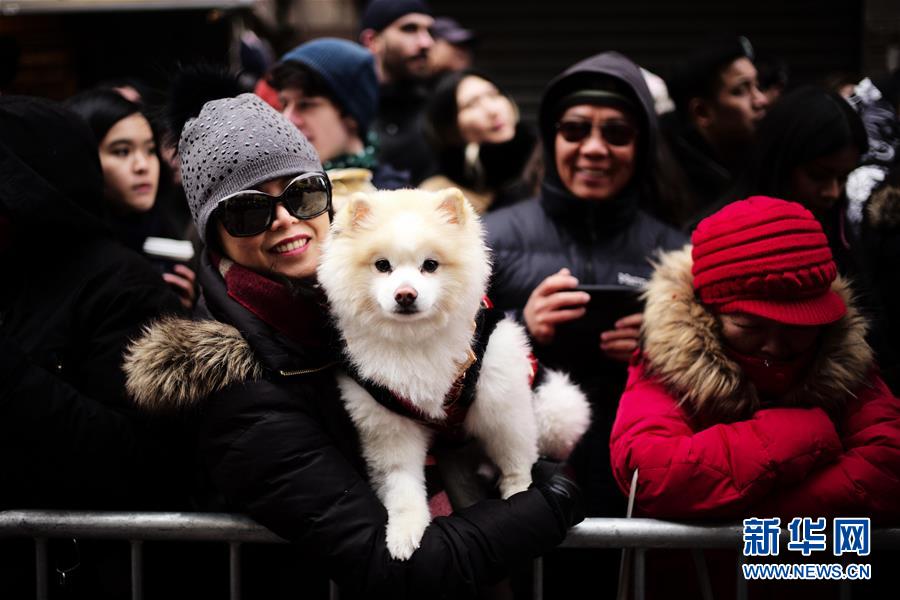 2月17日,在美国纽约,一名女子携爱犬观看新春大游行。 当日,纽约曼哈顿唐人街举行新春大游行,庆祝中国农历新年。 新华社记者李木子摄