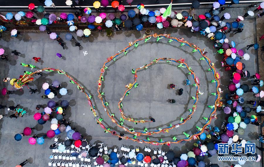 2月17日,乡村女子舞龙队队员抬着特色的板龙在窈口村的广场上进行表演,展示这一当地的非物质文化遗产(无人机拍摄)。 当日,浙江省杭州市富阳区湖源乡窈口村举办“别样元宵、年味乡愁”雨水节气活动,以年味和乡愁为主题,舞板龙唱大戏,展示国家级生态文化村窈口村的美丽乡村和独特的山水自然环境,在浓浓的传统山乡喜庆氛围中迎接元宵节。 窈口板龙源自清代,由当时走南闯北经商的村民从北方引进村内。长达130米的板龙由58张板凳连起来,板凳上有各种场景的灯笼装饰,近百名舞龙队员身穿传统服装,随着锣鼓的欢快节奏舞起龙灯,祈求新的一年风调雨顺。 新华社记者 徐昱 摄