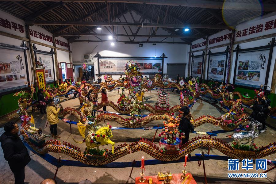 2月17日,村民们在村文化礼堂中观看展示中的窈口板龙。 当日,浙江省杭州市富阳区湖源乡窈口村举办“别样元宵、年味乡愁”雨水节气活动,以年味和乡愁为主题,舞板龙唱大戏,展示国家级生态文化村窈口村的美丽乡村和独特的山水自然环境,在浓浓的传统山乡喜庆氛围中迎接元宵节。 窈口板龙源自清代,由当时走南闯北经商的村民从北方引进村内。长达130米的板龙由58张板凳连起来,板凳上有各种场景的灯笼装饰,近百名舞龙队员身穿传统服装,随着锣鼓的欢快节奏舞起龙灯,祈求新的一年风调雨顺。 新华社记者 徐昱 摄