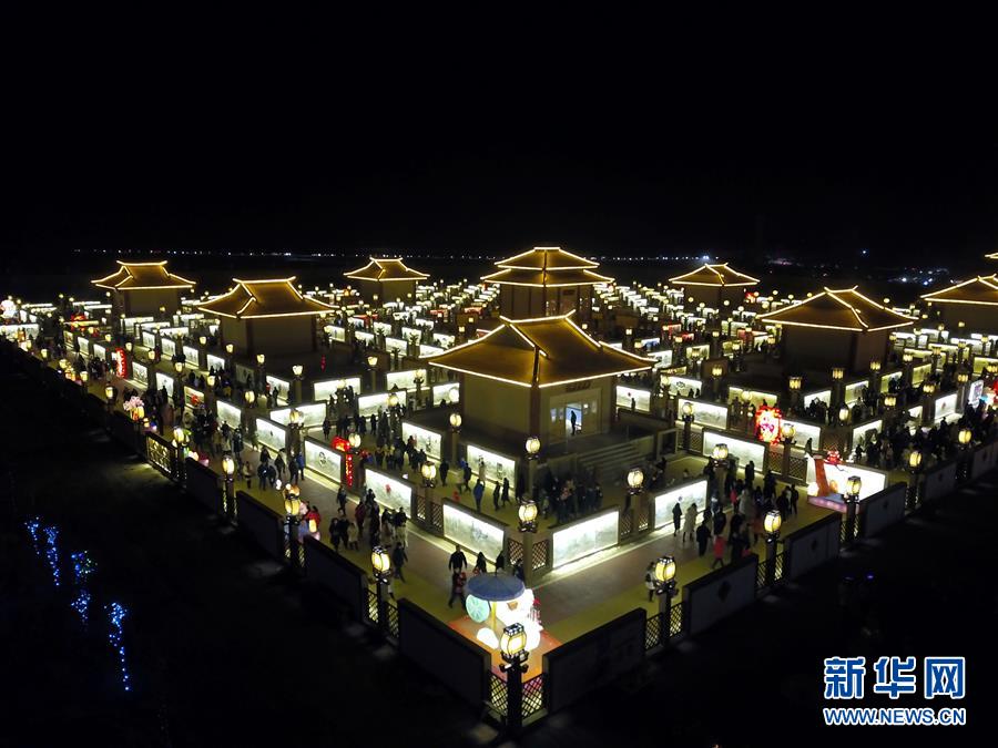 2月17日晚,游人在甘肃省张掖市九曲黄河灯阵赏灯(无人机拍摄)。 元宵节将至,各地张灯结彩,一派喜庆热闹的节日景象。 新华社发(成学磊 摄)