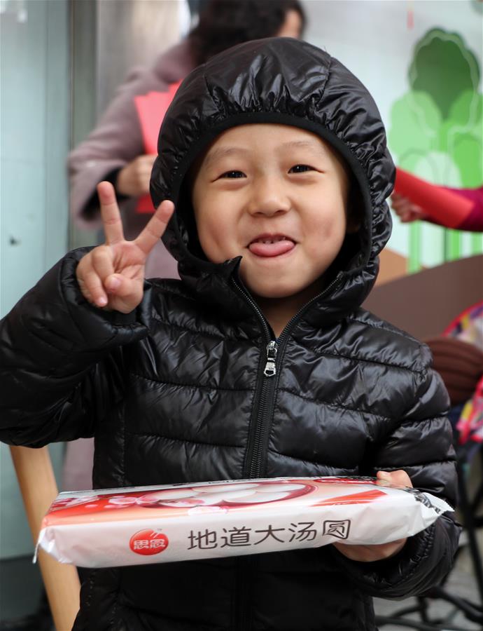 2月18日,儿童在北京东高地街道参加猜灯谜活动后获得奖品汤圆。新华社记者李欣摄