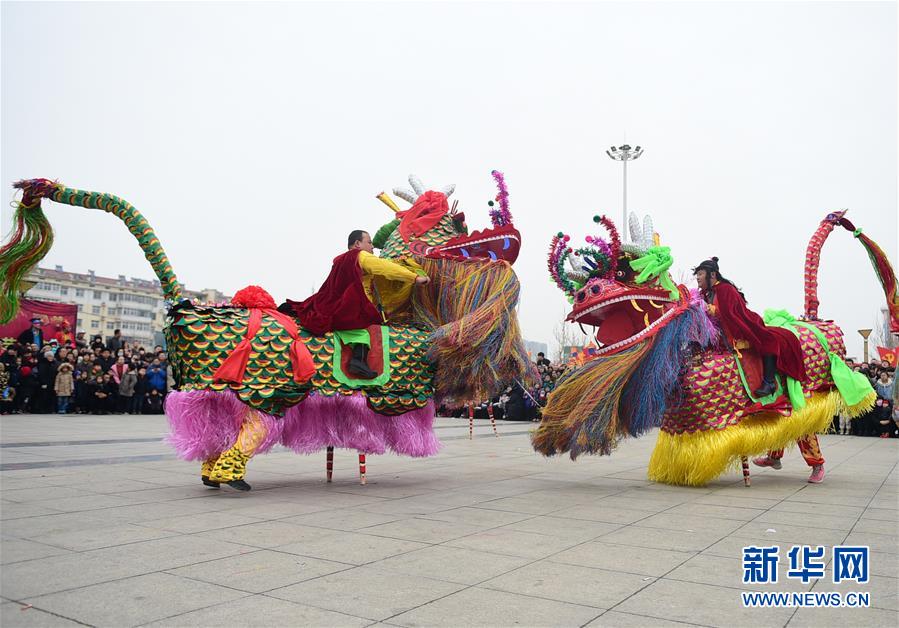2月18日,民间艺人在河北黄骅市举办的元宵节民间文艺汇演上表演“麒麟舞”。 元宵节将至,各地举办多彩的民俗活动,欢欢喜喜迎佳节。 新华社发(傅新春 摄)