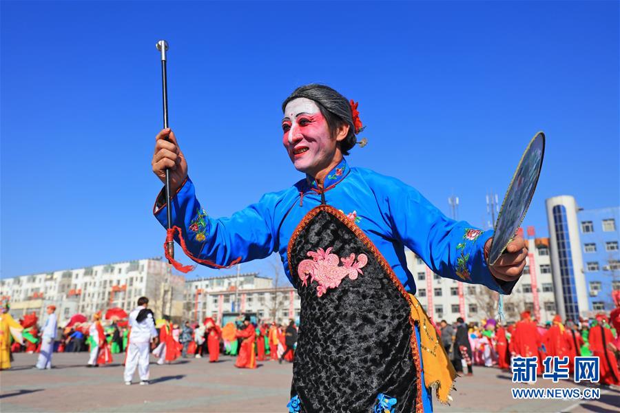 2月17日,民间艺人在河北省唐山市滦南县文化体育活动中心广场表演秧歌。 元宵节将至,各地举办多彩的民俗活动,欢欢喜喜迎佳节。 新华社发(张永新 摄)