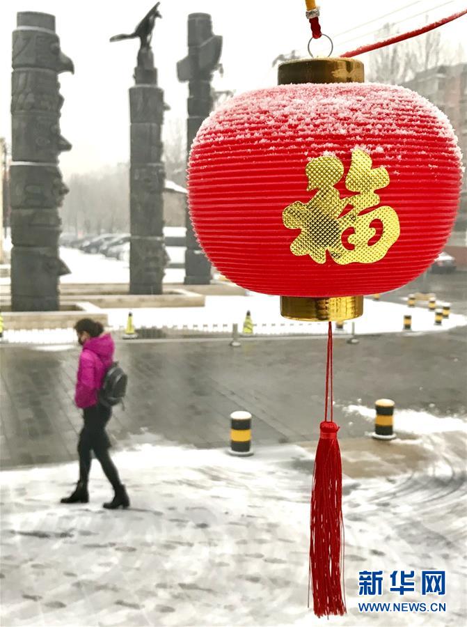 2月19日,北京东四环附近一处街道边的红灯笼上披上一层白雪。 当日是元宵节,北京迎来降雪,红灯白雪,相映成趣。 新华社记者 罗晓光 摄