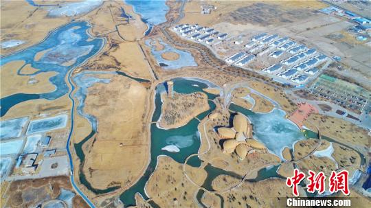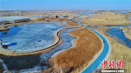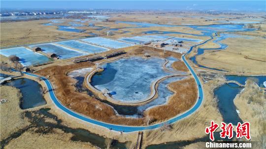 立春后,气温回升,地处甘肃河西走廊中部、祁连山下的甘肃张掖市国家湿地公园内的冰雪开始融化,从空中俯瞰,湖水、草地、冰雪构成美丽的画卷,成为当地一道美丽的生态景观。王超 摄