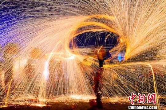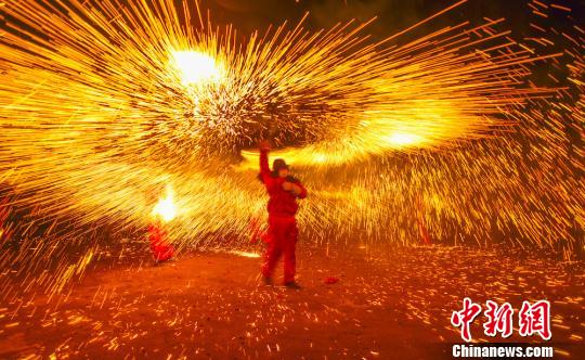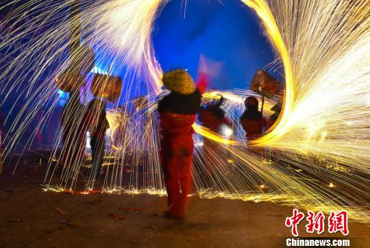 舞龙人手持龙灯穿巡于火花之中。 姜永宁 摄
