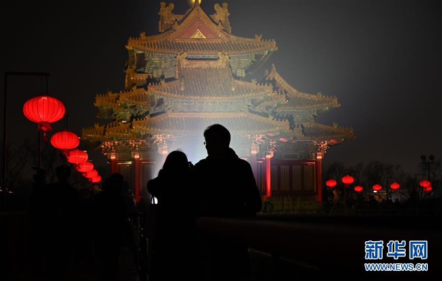 2月19日晚,游客在故宫城墙上参观。 新华社记者金良快摄