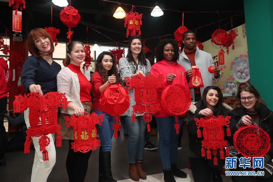 2月19日,上海大学的留学生展示他们制作的花灯。 新华社记者 丁汀 摄