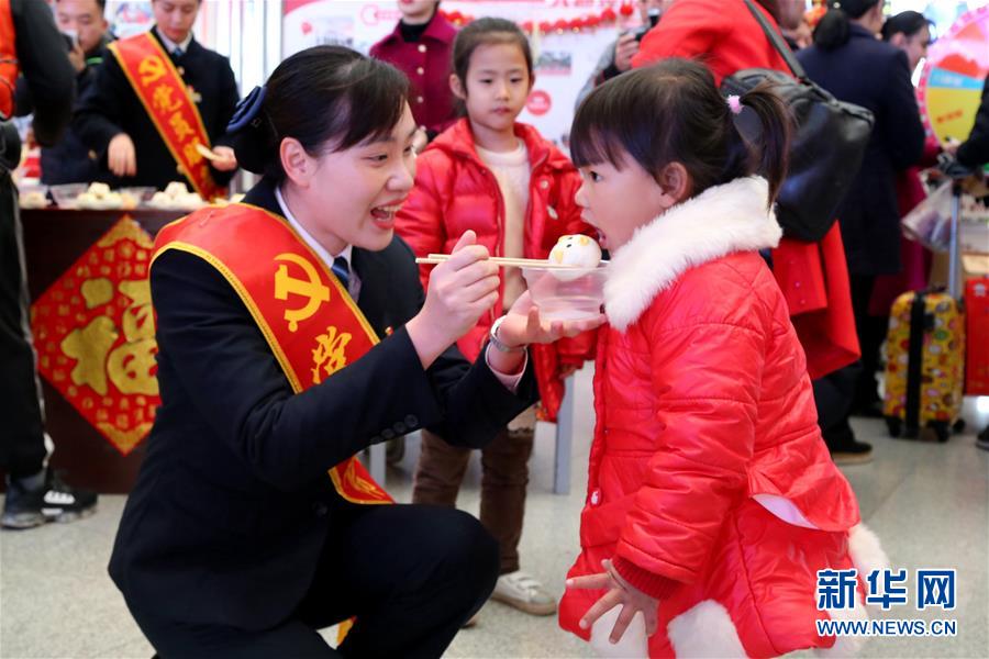 2月19日,在南宁东站,工作人员喂一名小朋友吃小猪包,让小旅客感受节日的甜蜜。 新华社发(林楚越 摄)