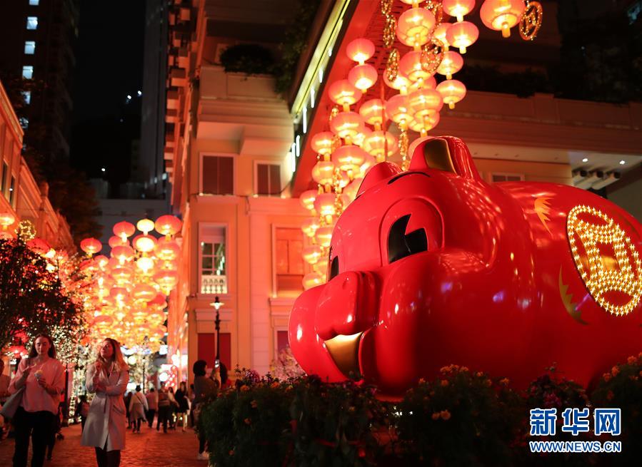 2月19日,在香港湾仔利东街,游客从红灯笼和象征富贵的“喜盈猪”前面经过。 新华社记者 李钢 摄