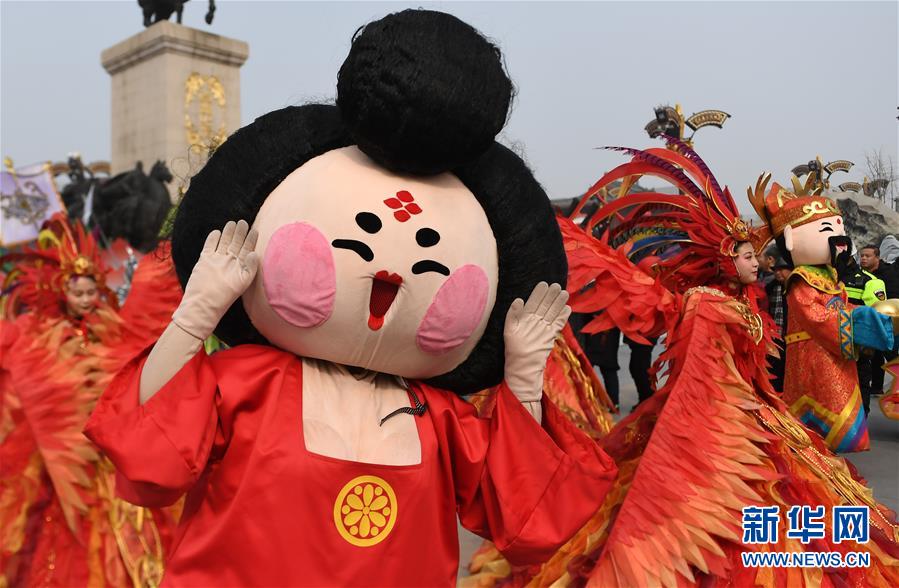 2月19日,花车巡游队伍在西安大唐不夜城·现代唐人街上巡游演出。 新华社记者 刘潇 摄