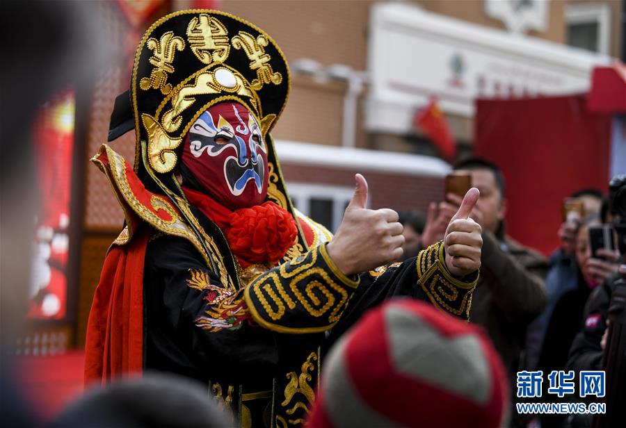 2月19日,在新疆乌鲁木齐大巴扎步行街,演员在表演川剧变脸。 新华社记者 王菲 摄
