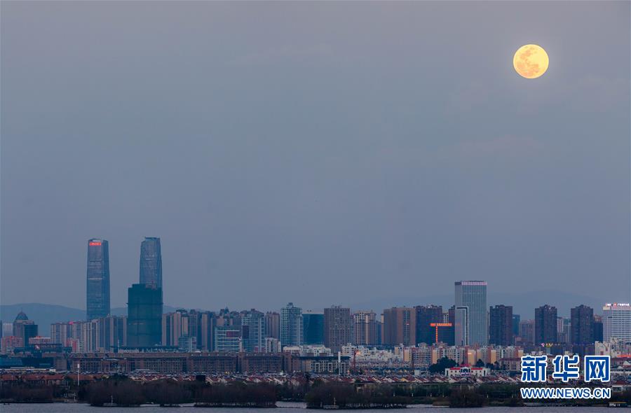 这是2月19日在昆明拍摄的月亮和城市风景。 当日是元宵佳节,本年度第二场“超级月亮”,也是年度“最大最圆月”现身天宇。 据介绍,“超级月亮”是指处于近地点位置附近的满月。此次天象与佳节的“巧遇”,为元宵赏月增加了看点,平添了情趣。 新华社记者 胡超 摄