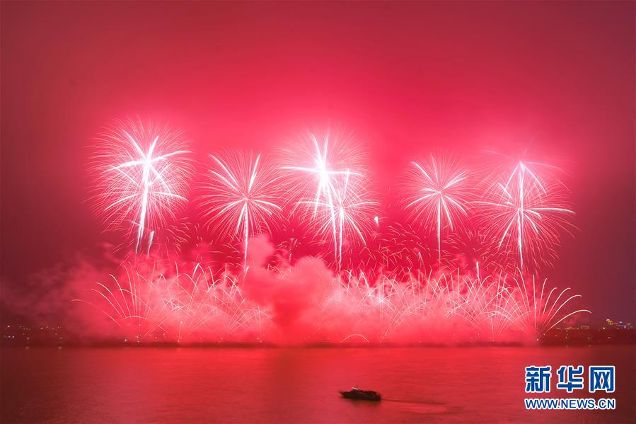2月19日,湖南长沙橘子洲上空绽放绚丽焰火。 当晚,多地举行焰火晚会,欢庆元宵佳节。 新华社发(陈泽国 摄)
