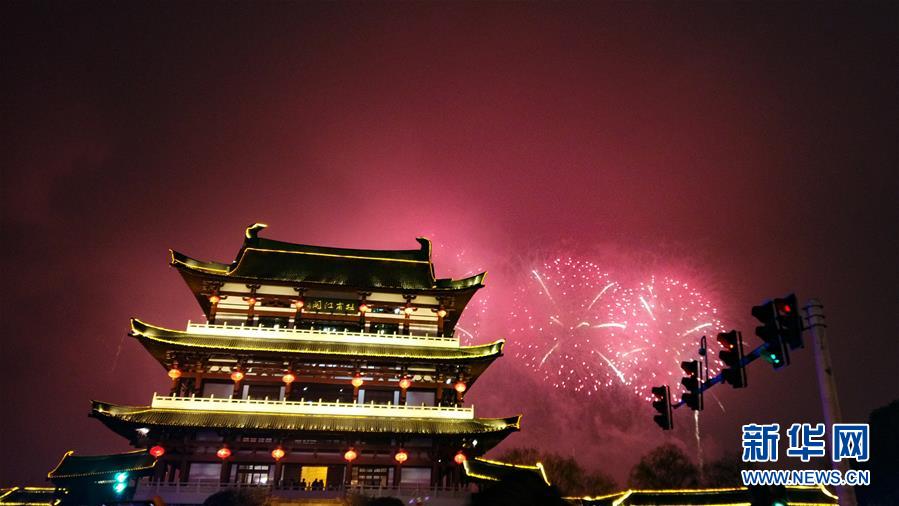 2月19日,湖南长沙橘子洲燃放的烟花与长沙城区的杜甫江阁交相辉映。 当晚,多地举行焰火晚会,欢庆元宵佳节。 新华社发(陈泽国 摄)