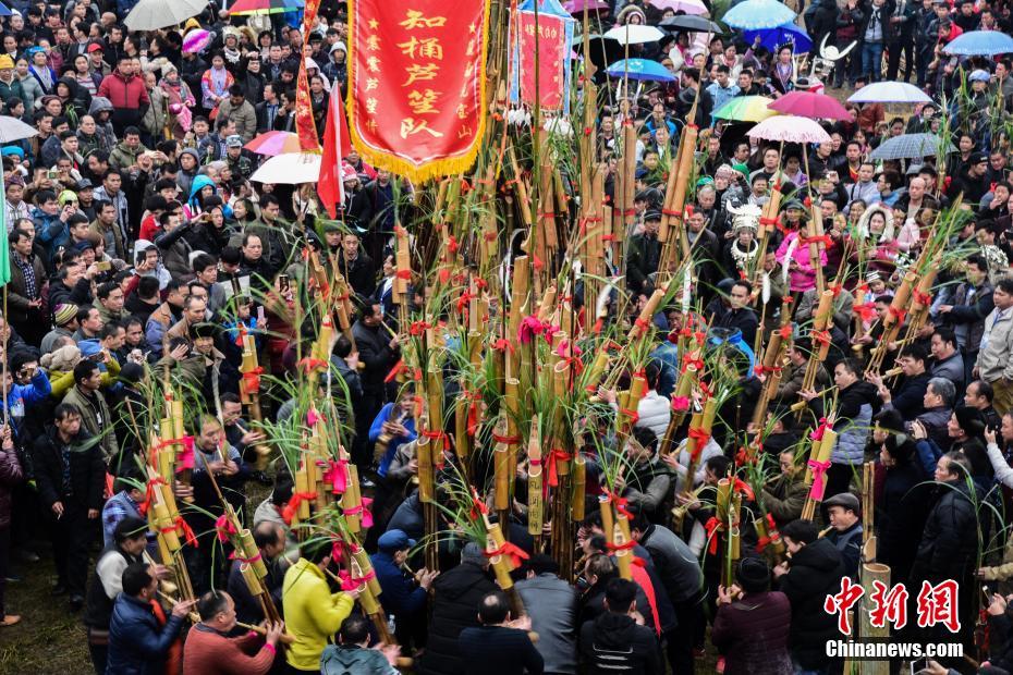 2月20日正月十六,是广西柳州市融水苗族自治县香粉乡的传统节日“正月十六古龙坡会”。当天的“芦笙比响”比赛上,37个参赛队以一对一的形式进行比赛,裁判在300米外的山坡上根据听响度决定胜负,并举旗示意。本次比赛每队有选手40人左右,至少1500名芦笙选手参赛,比赛吸引当地苗、瑶、侗、壮等至少1万名各族群众前来观看。王以照 摄