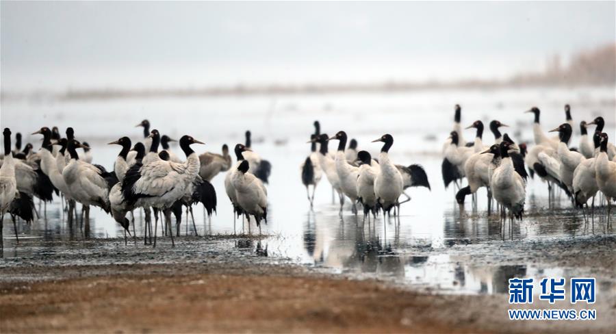 2月21日在草海国家级自然保护区内拍摄的黑颈鹤。 新华社记者杨楹摄