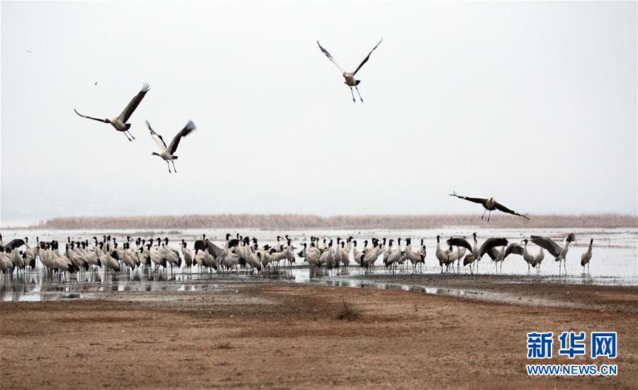 2月21日在草海国家级自然保护区内拍摄的黑颈鹤。 新华社发(罗大富 摄)