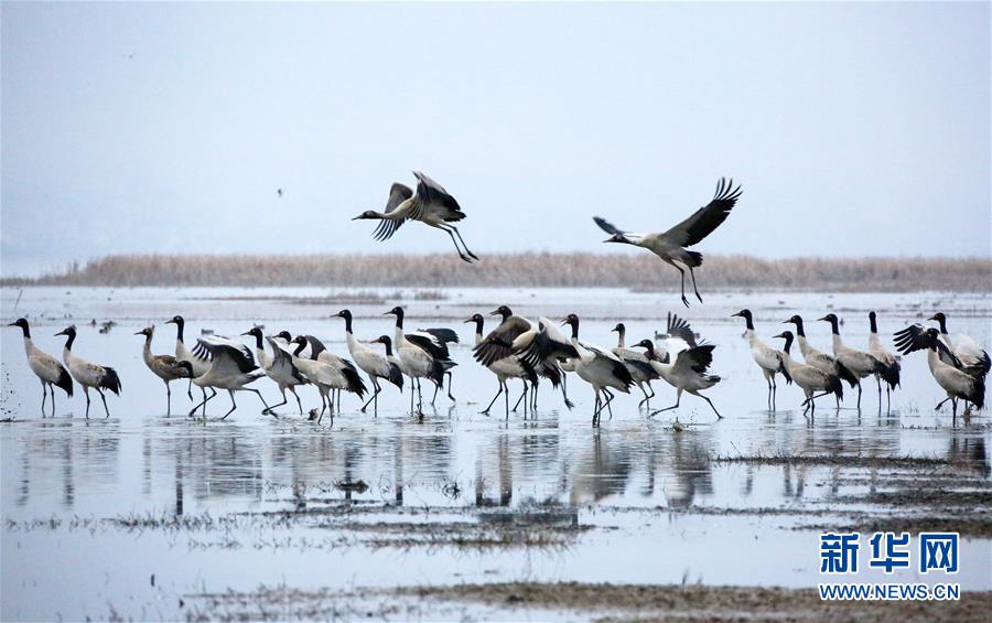 2月21日在草海国家级自然保护区内拍摄的黑颈鹤。 新华社发(何欢 摄)