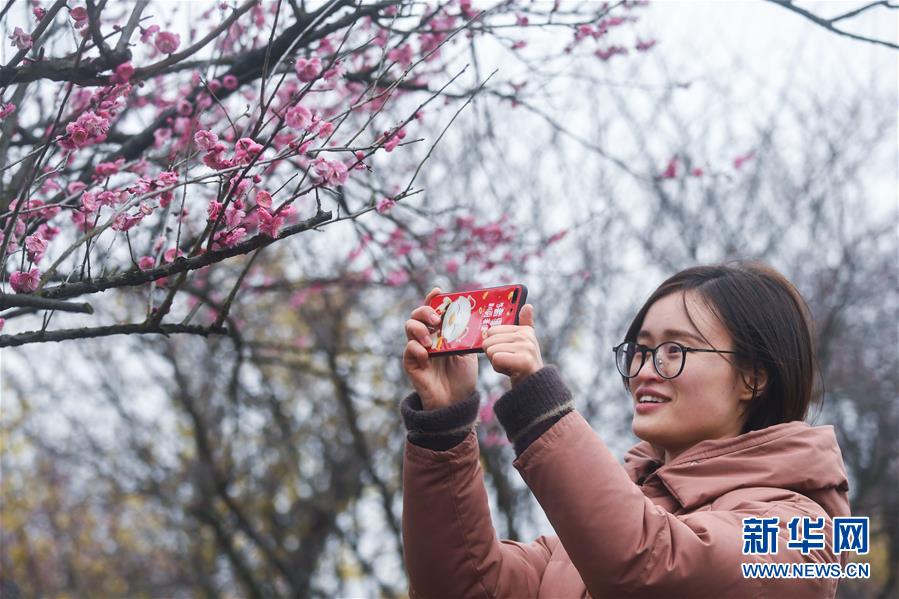 2月21日,游客在林城镇连心村的东方梅园拍摄梅花。 新华社记者 徐昱 摄