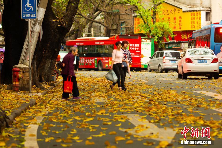 2月21日下午,一场春雨打落满地黄叶,广州呈现出一派“秋天”的景色。广州老城区大量种植的大叶榕,通常会在春天发新叶芽前落叶。因此,每年广州的春天反而呈现秋色。中新社记者 柯小军 摄