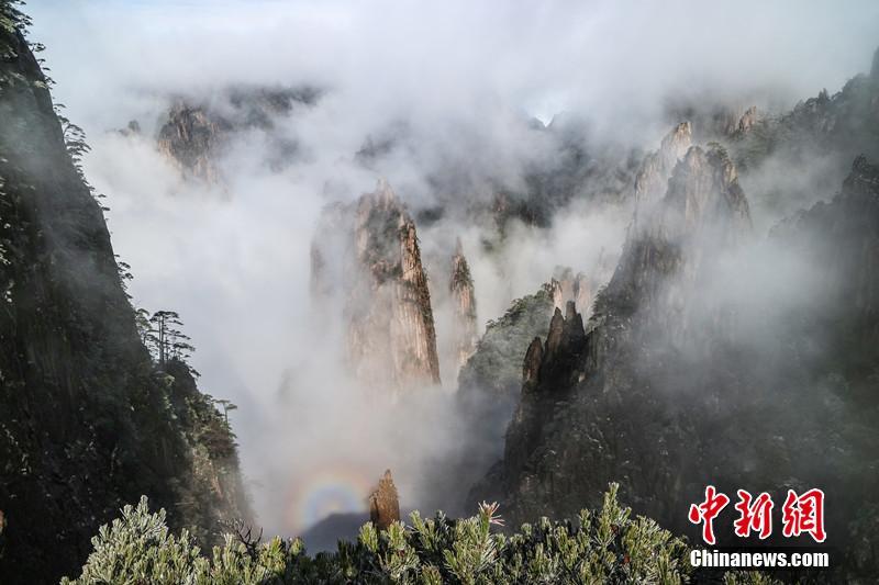 2月22日,一场春雪过后,安徽黄山风景区天空放晴,蓝天白云之下是层层白雪覆盖的山峦。奇松怪石银装素裹,花草林木皆披玉衣。当日,随着山风吹拂,峡谷之间云雾升腾,形成大面积云海景观。阳光照射其间,峡谷云雾折射,形成“佛光”。文/刘浩 图/李金刚