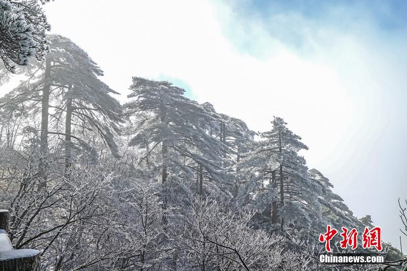 蓝天白云之下,黄山奇松银装素裹,晶莹夺目。文/刘浩 图/李金刚