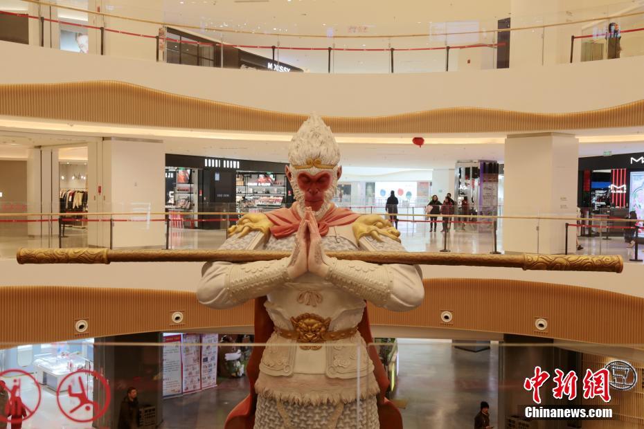 2月22日,西安大雁塔广场附近的一家商场内,一座七米高的“齐天大圣”雕塑吸引了市民和游客观赏、拍照。中新社记者 张远 摄