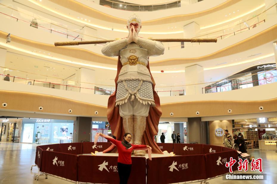 2月22日,西安大雁塔广场附近的一家商场内,一座七米高的“齐天大圣”雕塑吸引了市民和游客观赏、拍照。中新社记者 张远 摄