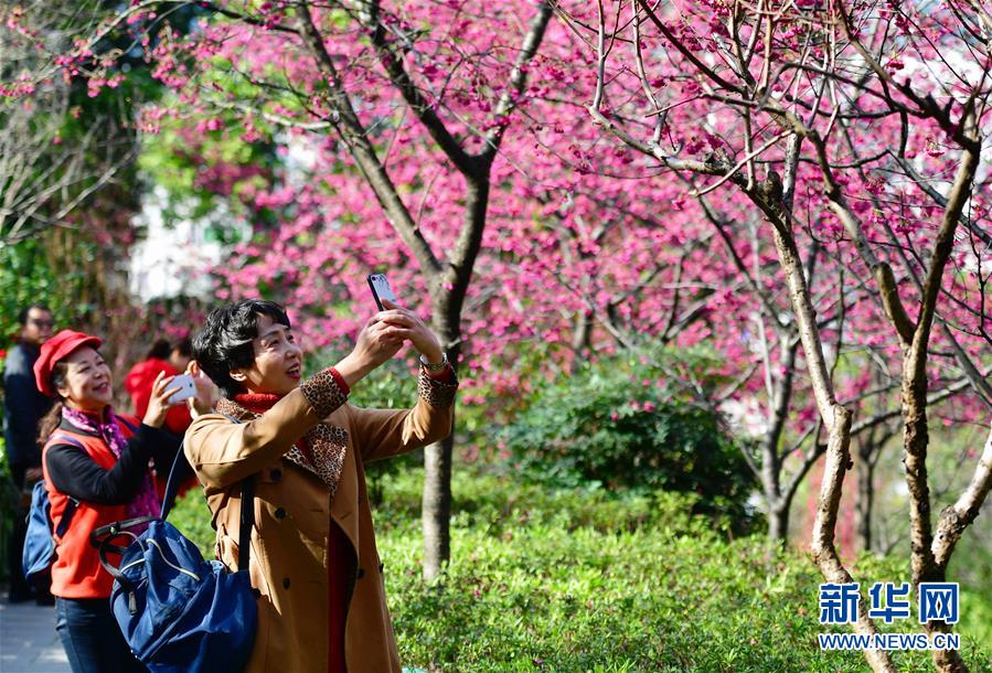 2月22日,在福州市乌山风景区里的天皇岭登山道,游客们观赏拍摄山樱花。 近日,福建省福州市春光明媚,花红柳绿,一派生机勃勃的初春景象。 新华社记者魏培全摄