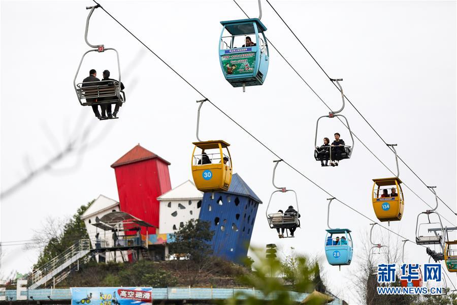 2月24日,游客在重庆美心洋人街景区乘坐观光索道。新华社记者 刘潺 摄