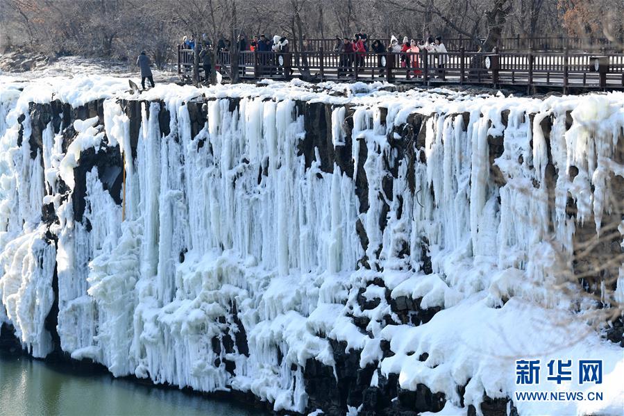 2月25日,游客在观赏冰瀑景观。 去冬今春以来,黑龙江省镜泊湖的吊水楼冰瀑景色壮观,吸引许多游人前来观赏。 新华社记者 王建威 摄