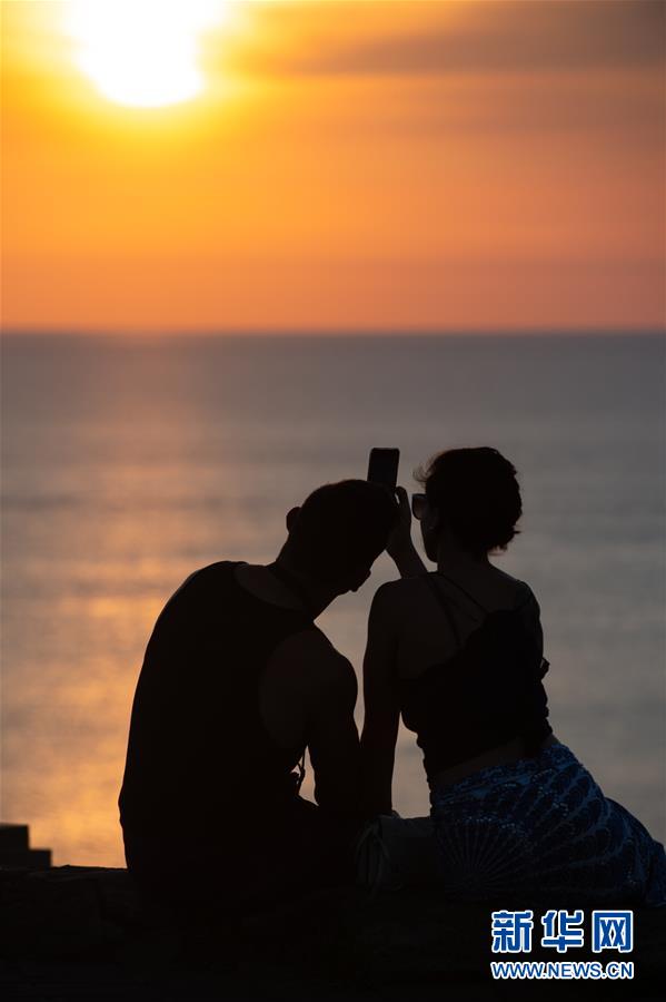 2月25日,在印度尼西亚巴厘岛情人崖,一对情侣在日落时拍摄。 情人崖雄奇险峻的风景吸引着许多游客前来参观游览。 新华社记者 杜宇 摄