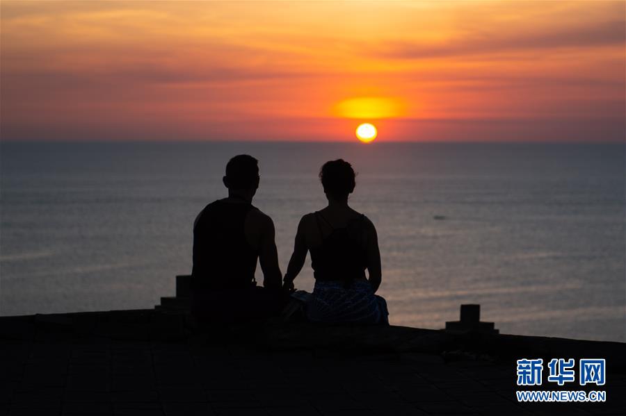 2月25日,在印度尼西亚巴厘岛情人崖,一对情侣欣赏日落景色。 情人崖雄奇险峻的风景吸引着许多游客前来参观游览。 新华社记者 杜宇 摄